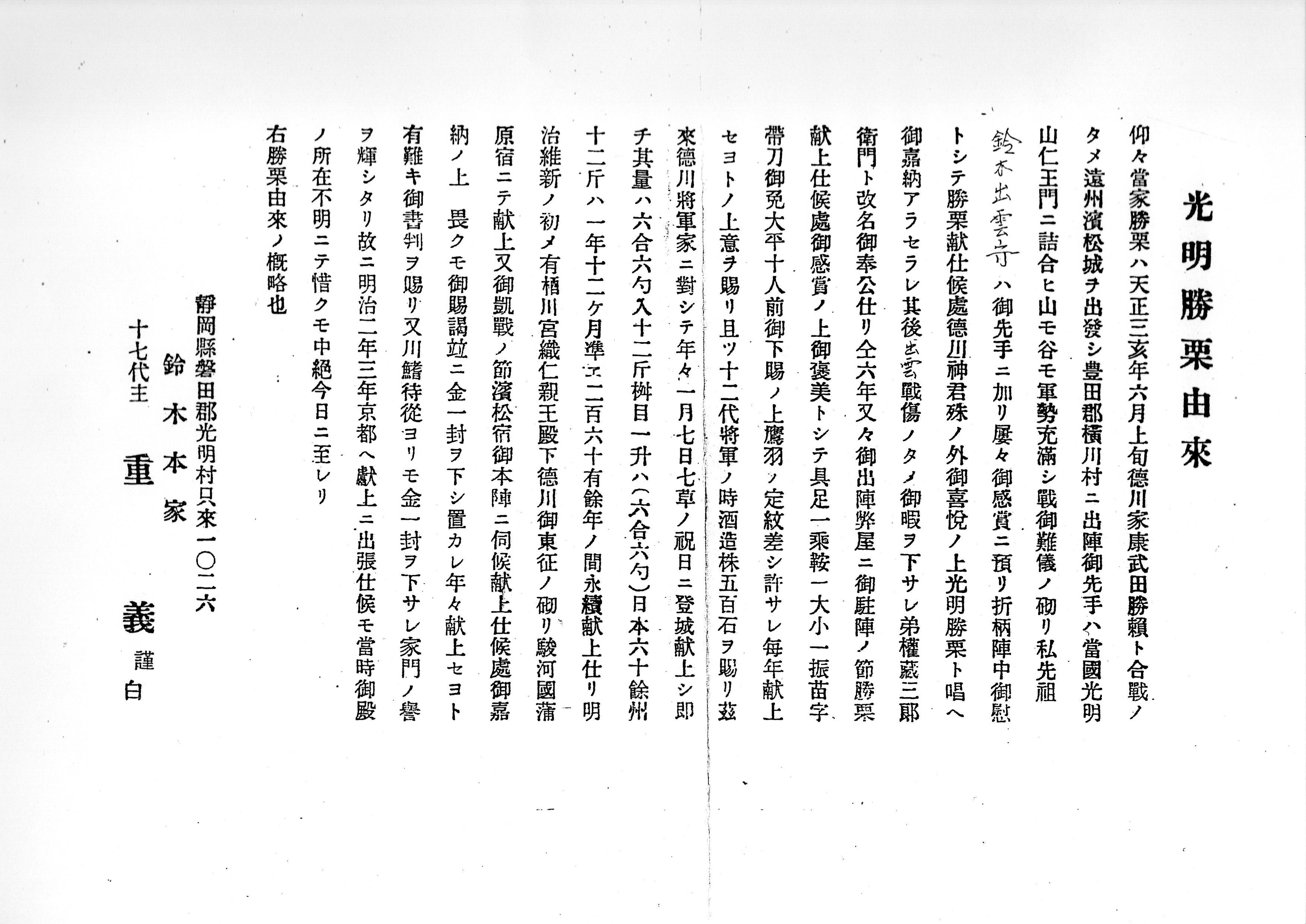 (出典)愛知学院大学論文(8) 一般教育研究 1964-09,P25-50 (国立国会図書館所蔵) - 光明勝栗由来(鈴木重義(17代鈴木家当主)