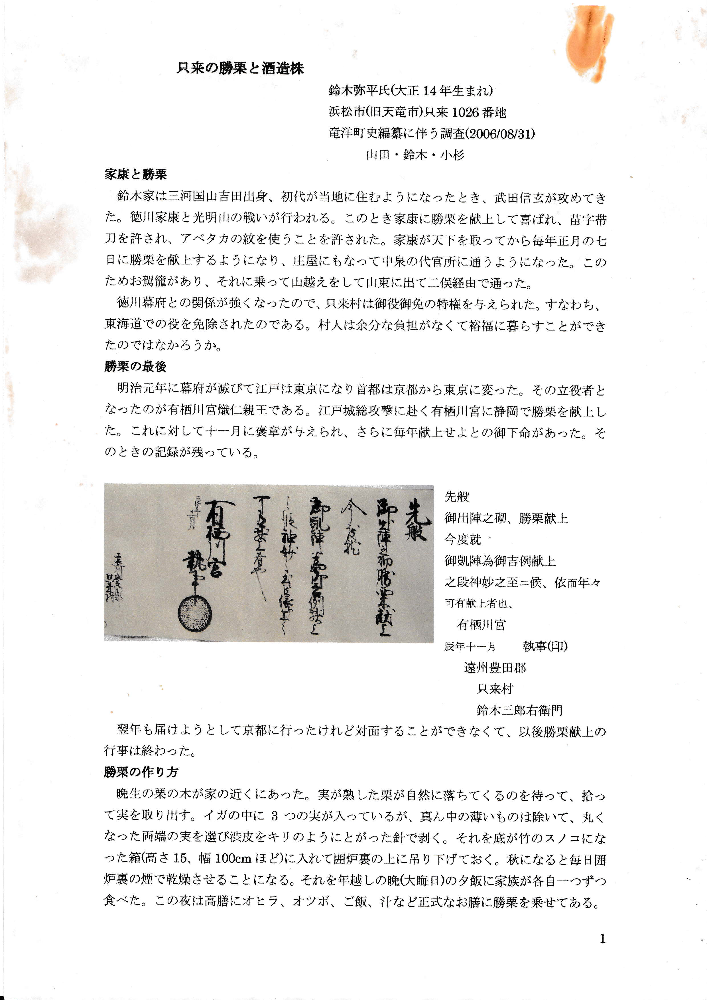 - 只来の勝栗と酒造株(鈴木弥平(18代鈴木家当主), 竜洋町史編纂に伴う調査(2006/08/31)